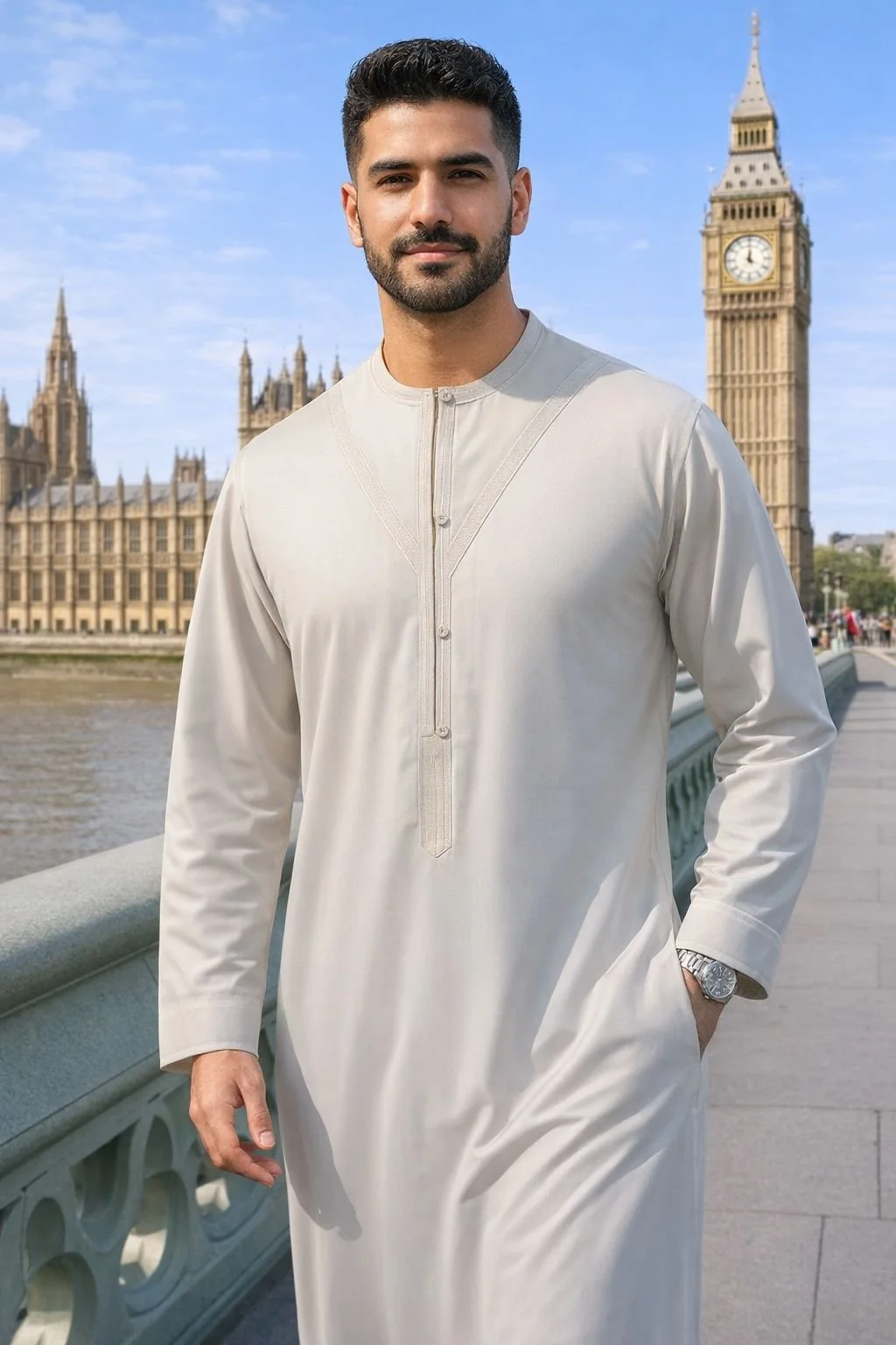 Sophistication in simplicity. This stone-grey Thobe offers a clean, architectural look with its hidden